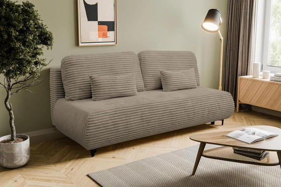 - Ein kompaktes, beige Schlafsofa für ein kleines Wohnzimmer oder Jugendzimmer vereint gutes Design mit praktischen Lösungen.