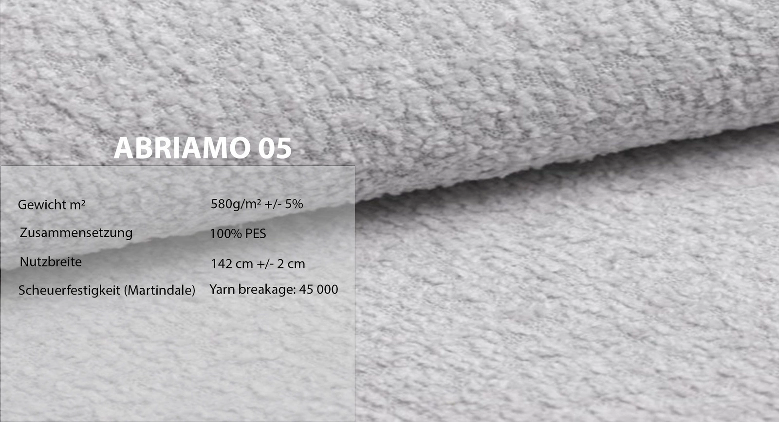 Abriamo iist ein eleganter Bouclé-Stoff, der sich durch seine dreidimensionale Struktur auszeichnet. Seine Schwerentflammbarkeit und Lichtbeständigkeit machen ihn zu einer funktionalen Lösung sowohl für öffentliche als auch für private Räume.).