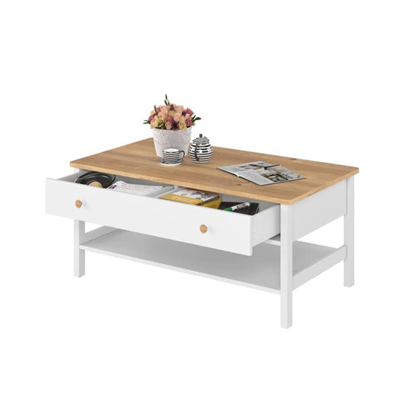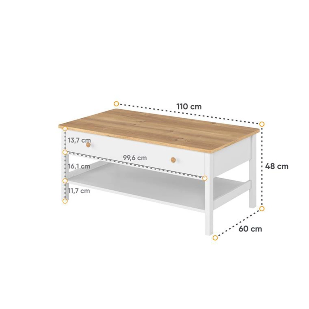 - Unser Couchtisch ist nicht nur ein Platz für Ihren Kaffee. Mit einem zusätzlichen Regal und einer Schublade erhalten Sie Platz für Bücher, Zeitschriften, Fernbedienungen und andere Kleinigkeiten.