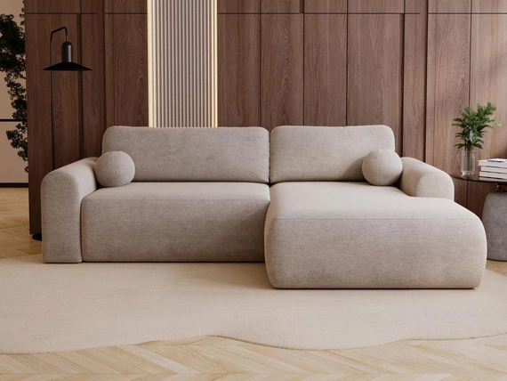 • Velvet Designer Ecksofa Aura mit seinen elefanten, abgerundeten Kanten ist das perfekte Möbelstück für anspruchsvolle Kunden. Farbe hellbeige, seite rechts