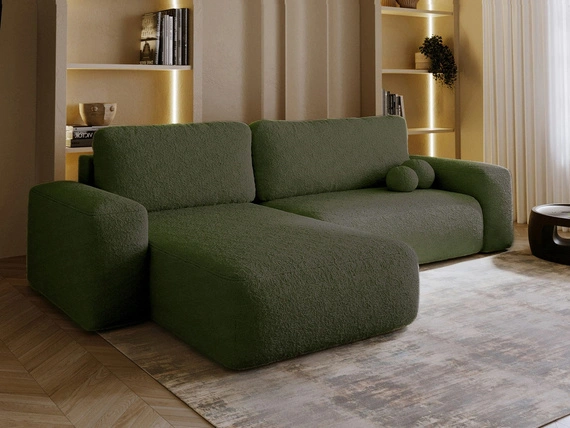 - Großes Tedis L-Form Ecksofa links in Bouclé - mit Schlaffunktion und Stauraum. Erhältlich in vielen modischen Farben. Schau dir die olivgrün Version an!