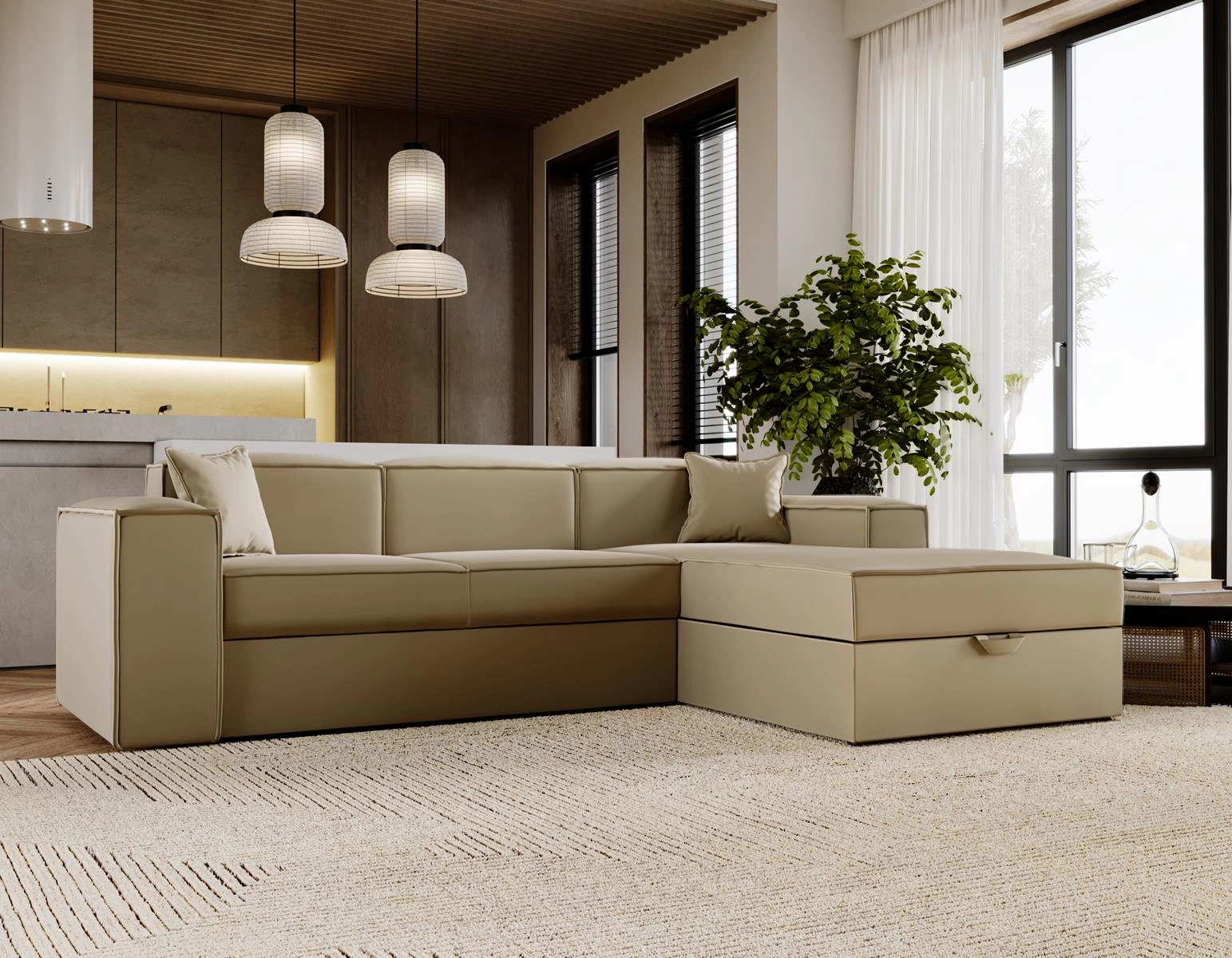 - Das SANTO Ecksofa verfügt über eine Schlaffunktion, mit der Sie es schnell und einfach in ein bequemes Bett verwandeln können. Die Ecke ist auch mit einem praktischen Bettlakenbehälter ausgestattet, der diskret unter dem Sitz verstaut wird.