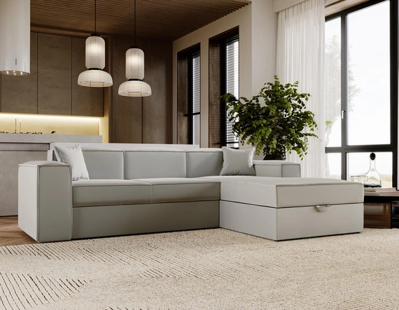 - Das SANTO Ecksofa verfügt über eine Schlaffunktion, mit der Sie es schnell und einfach in ein bequemes Bett verwandeln können. Die Ecke ist auch mit einem praktischen Bettlakenbehälter ausgestattet, der diskret unter dem Sitz verstaut wird.