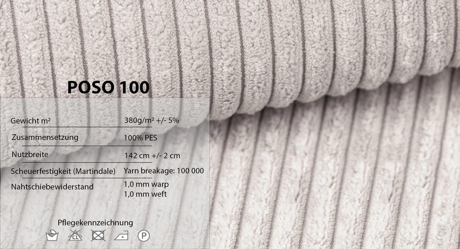 POSO ist ein ultraweicher Cord mit dicken Nadelstreifen, der sich unglaublich angenehm und weich anfühlt. Darüber hinaus verfügt es über hervorragende technische Parameter (siehe Foto).