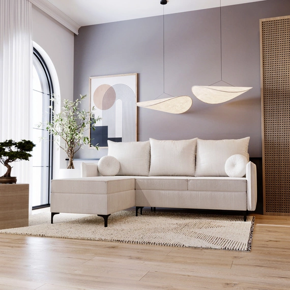- Das LEO Ecksofa verfügt über eine Schlaffunktion, mit der Sie es schnell und einfach in ein bequemes Bett verwandeln können. Die Ecke ist auch mit einem praktischen Bettlakenbehälter ausgestattet, der diskret unter dem Sitz verstaut wird.