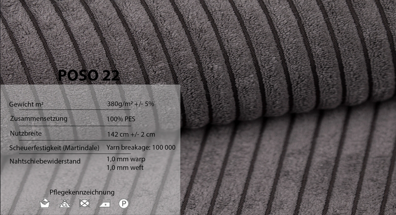 POSO ist ein ultraweicher Cord mit dicken Nadelstreifen, der sich unglaublich angenehm und weich anfühlt. Darüber hinaus verfügt es über hervorragende technische Parameter (siehe Foto).