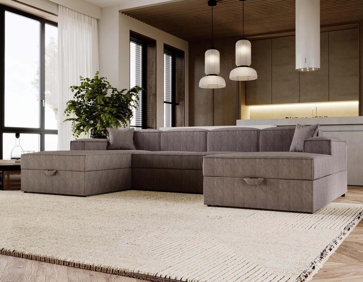 - Das SANTO Ecksofa verfügt über eine Schlaffunktion, mit der Sie es schnell und einfach in ein bequemes Bett verwandeln können. Die Ecke ist auch mit einem praktischen Bettlakenbehälter ausgestattet, der diskret unter dem Sitz verstaut wird.