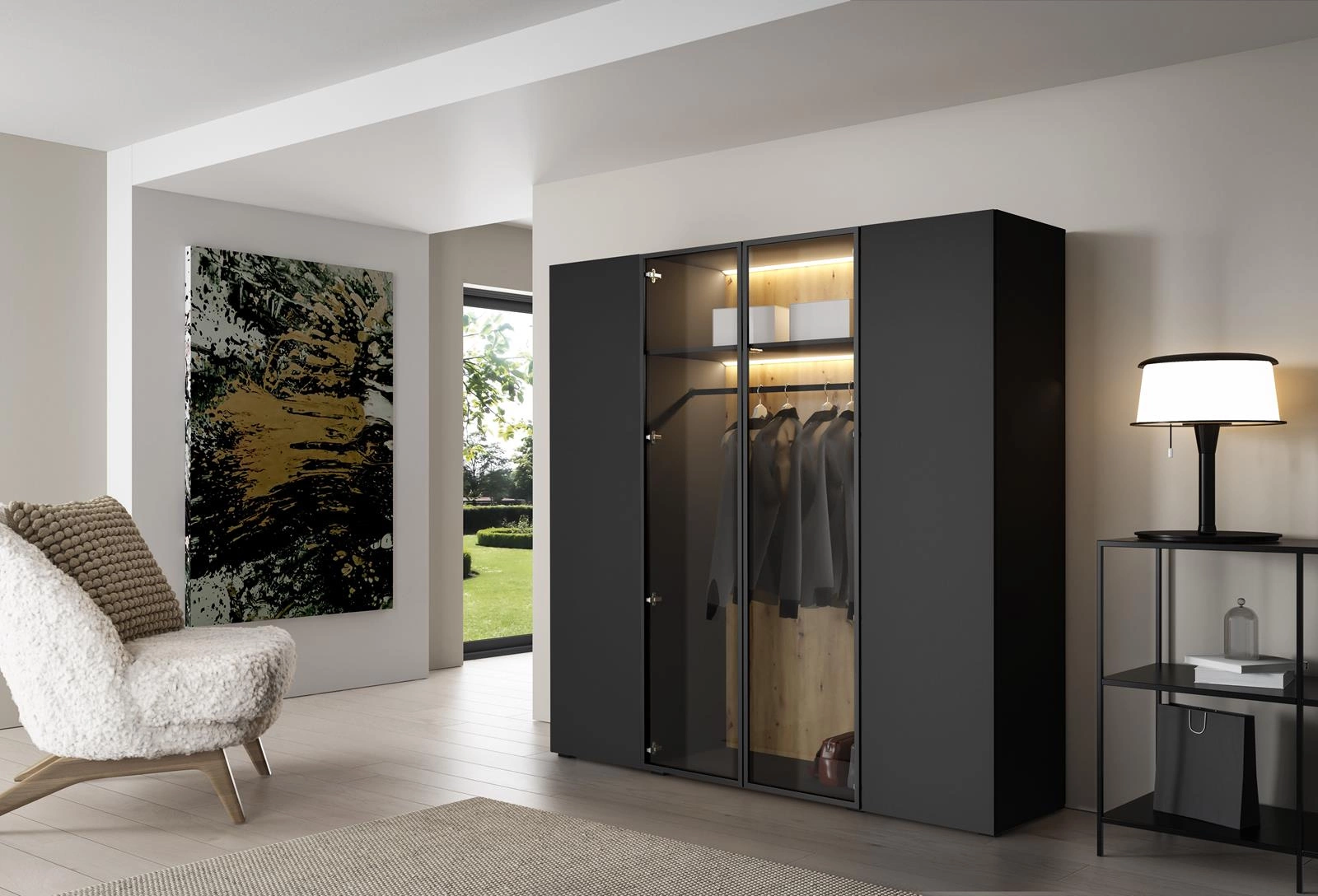 Eleganter Drehtürenschrank mit Glasfront LED Licht Schwarz STELLS