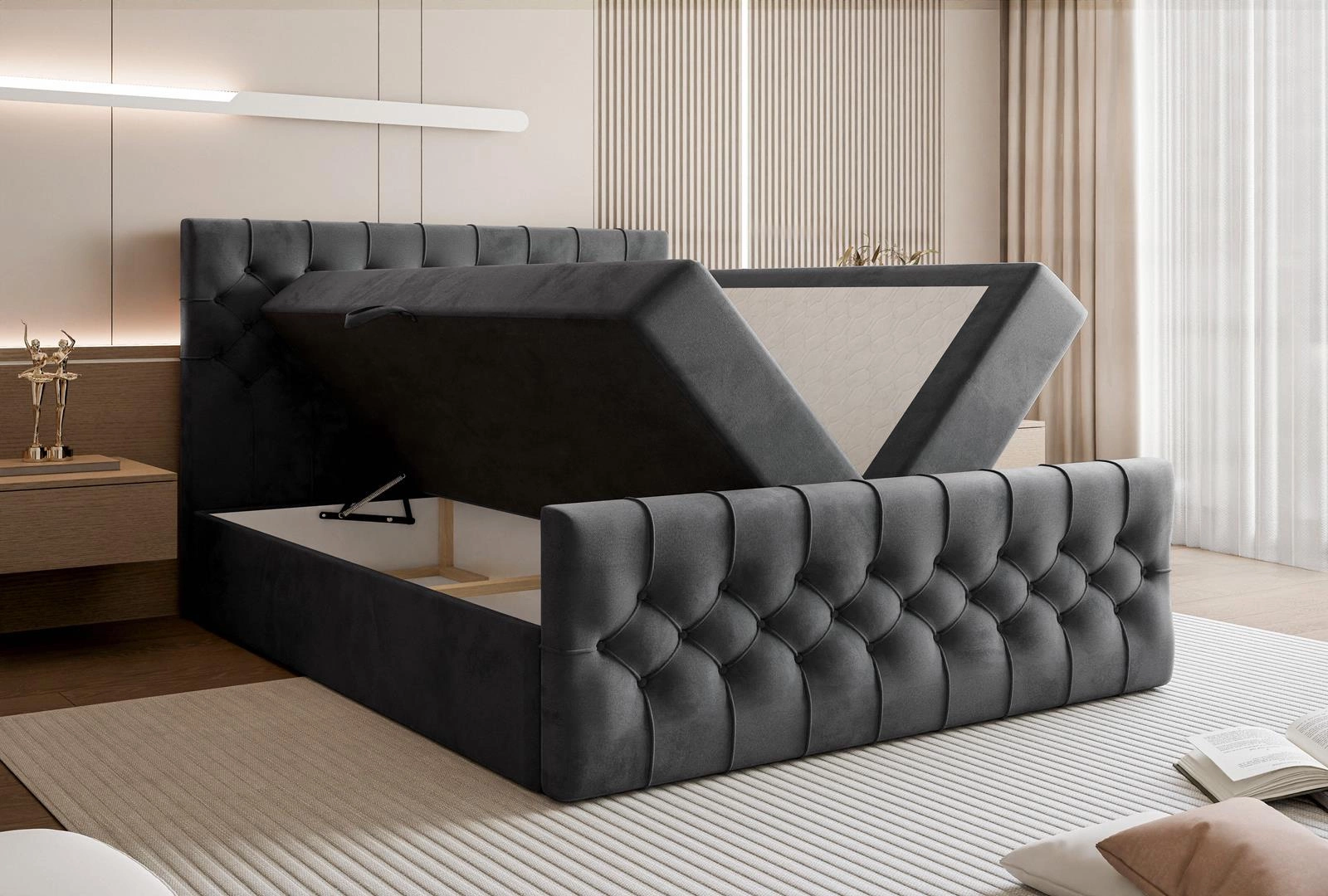 - Bettkästen: Ausgestattet mit zwei Bettkästen auf beiden Seiten des Bettes