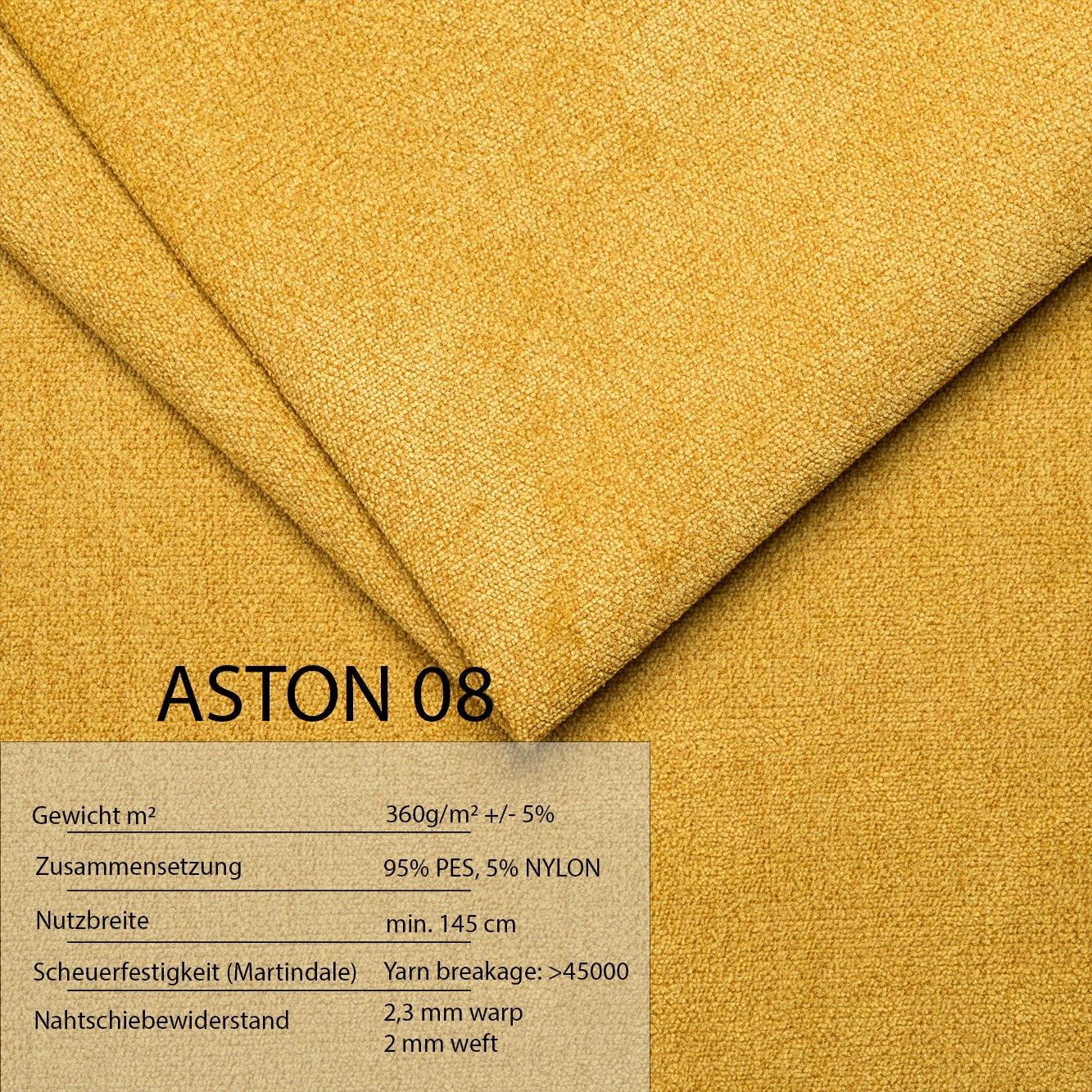 Aston (Velour-/Flockstoff) ist ein weicher Stoff, der zur Gruppe der Plüschstoffe gehört. Es zeichnet sich durch hohe Elastizität aus. Es verfärbt sich nicht, wenn es dem Licht ausgesetzt wird - es verblasst nicht. Widerstandsfähig gegen Abrieb, flammhemmend, leicht zu reinigen mit einer hydrophoben Beschichtung.