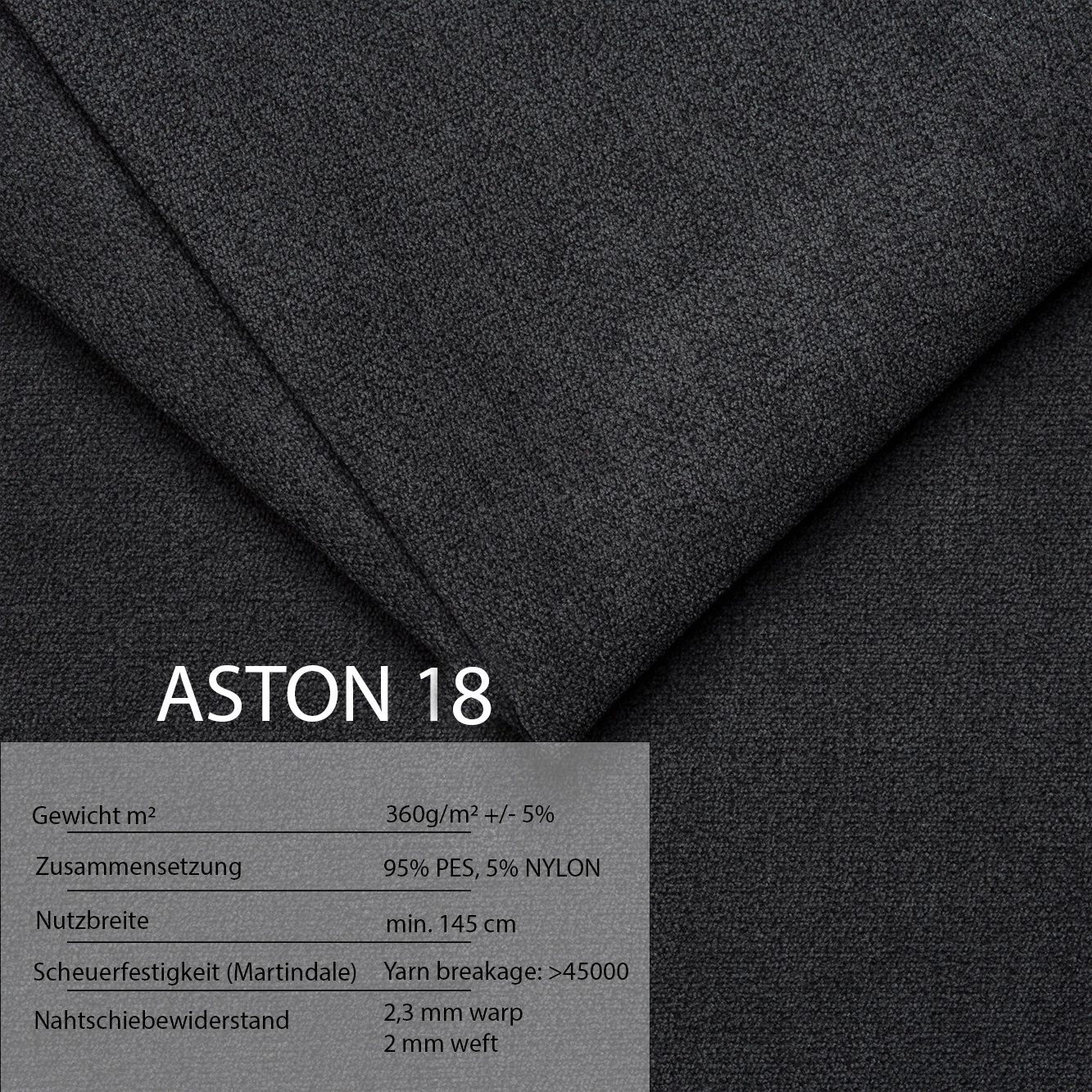 Aston (Velour-/Flockstoff) ist ein weicher Stoff, der zur Gruppe der Plüschstoffe gehört. Es zeichnet sich durch hohe Elastizität aus. Es verfärbt sich nicht, wenn es dem Licht ausgesetzt wird - es verblasst nicht. Widerstandsfähig gegen Abrieb, flammhemmend, leicht zu reinigen mit einer hydrophoben Beschichtung.