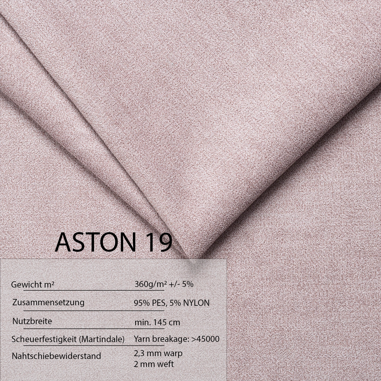 Aston (Velour-/Flockstoff) ist ein weicher Stoff, der zur Gruppe der Plüschstoffe gehört. Es zeichnet sich durch hohe Elastizität aus. Es verfärbt sich nicht, wenn es dem Licht ausgesetzt wird - es verblasst nicht. Widerstandsfähig gegen Abrieb, flammhemmend, leicht zu reinigen mit einer hydrophoben Beschichtung.