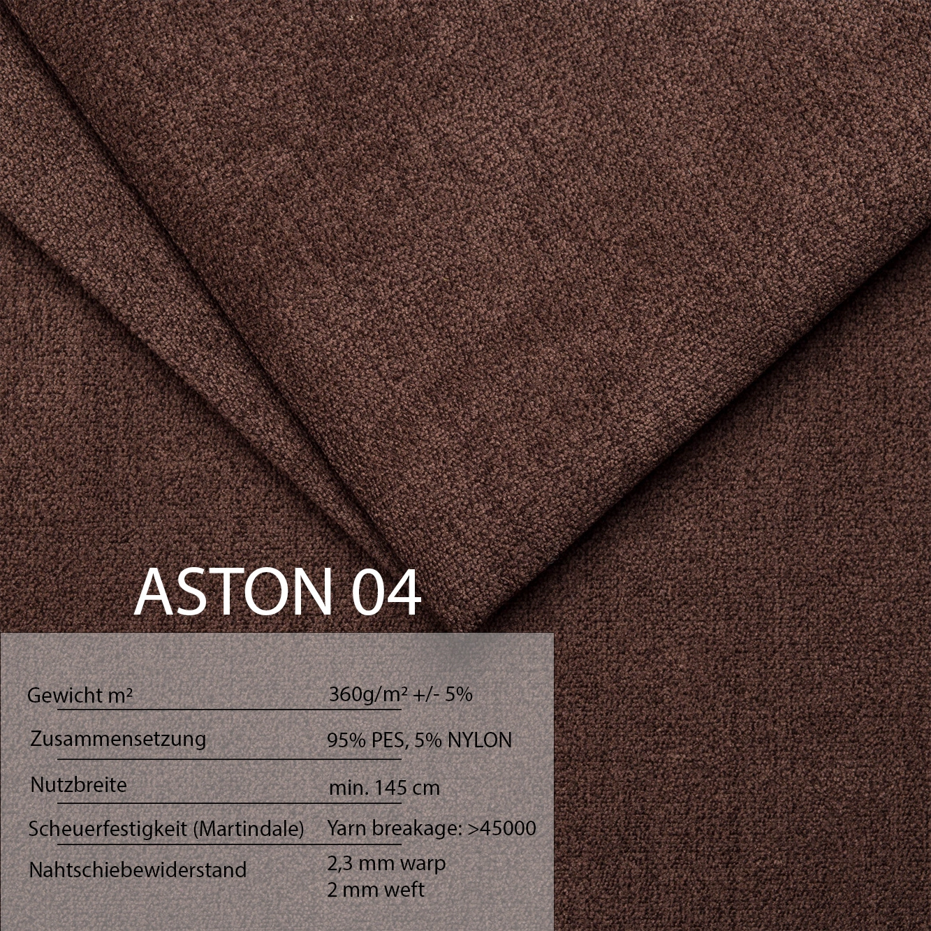 Abrieb Martindale-Test: 35.000 Zyklen, Gewicht: 360g / M2 / ~5%, Zusammensetzung: 95% Polyester 5% Nylon