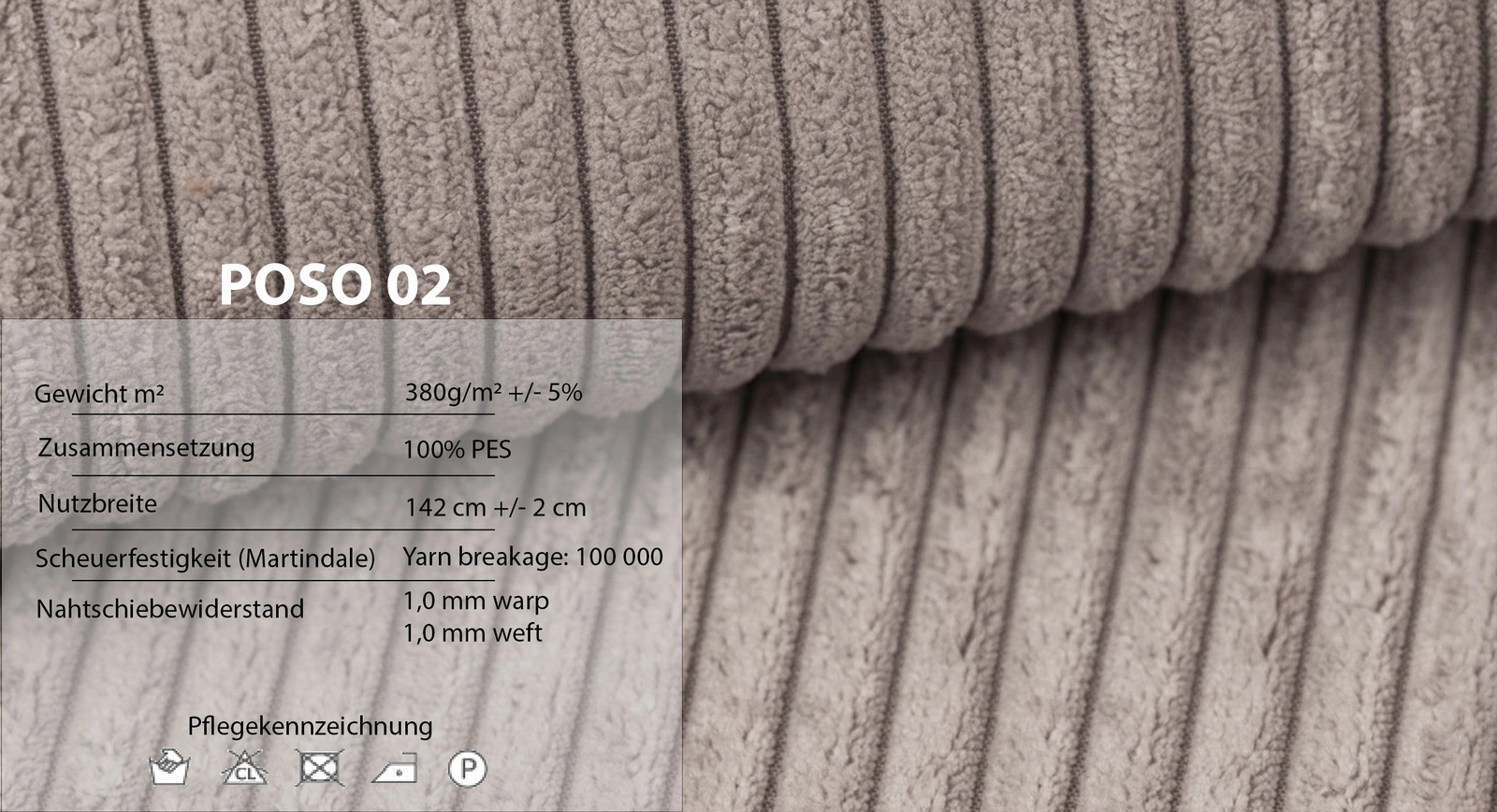 POSO ist ein ultraweicher Cord mit dicken Nadelstreifen, der sich unglaublich angenehm und weich anfühlt. Darüber hinaus verfügt es über hervorragende technische Parameter (siehe Foto).