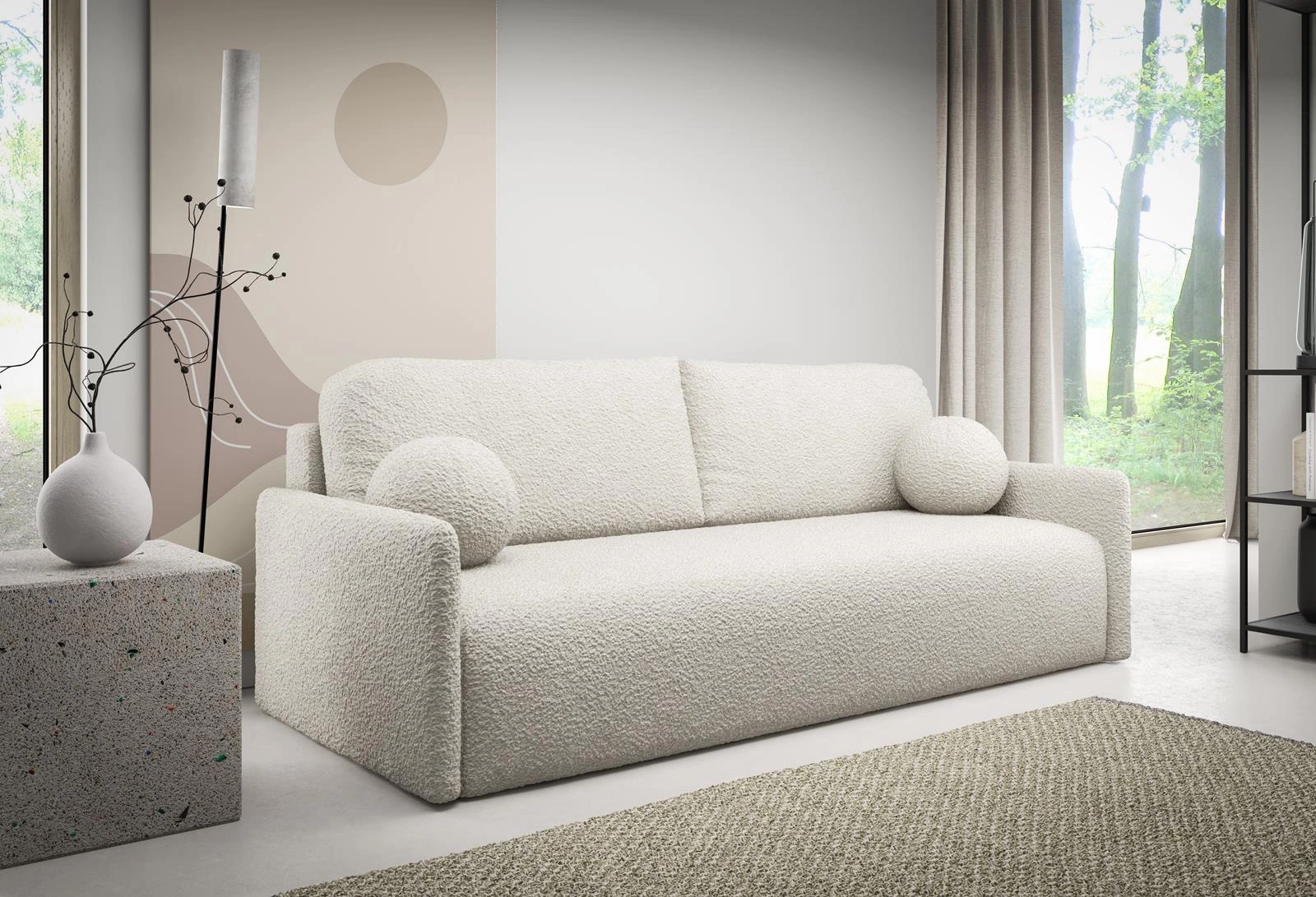 - Abriamo ist ein eleganter Bouclé-Stoff, der sich durch seine dreidimensionale Struktur auszeichnet. Seine Schwerentflammbarkeit und Lichtbeständigkeit machen ihn zu einer funktionalen Lösung sowohl für öffentliche als auch für private Räume.