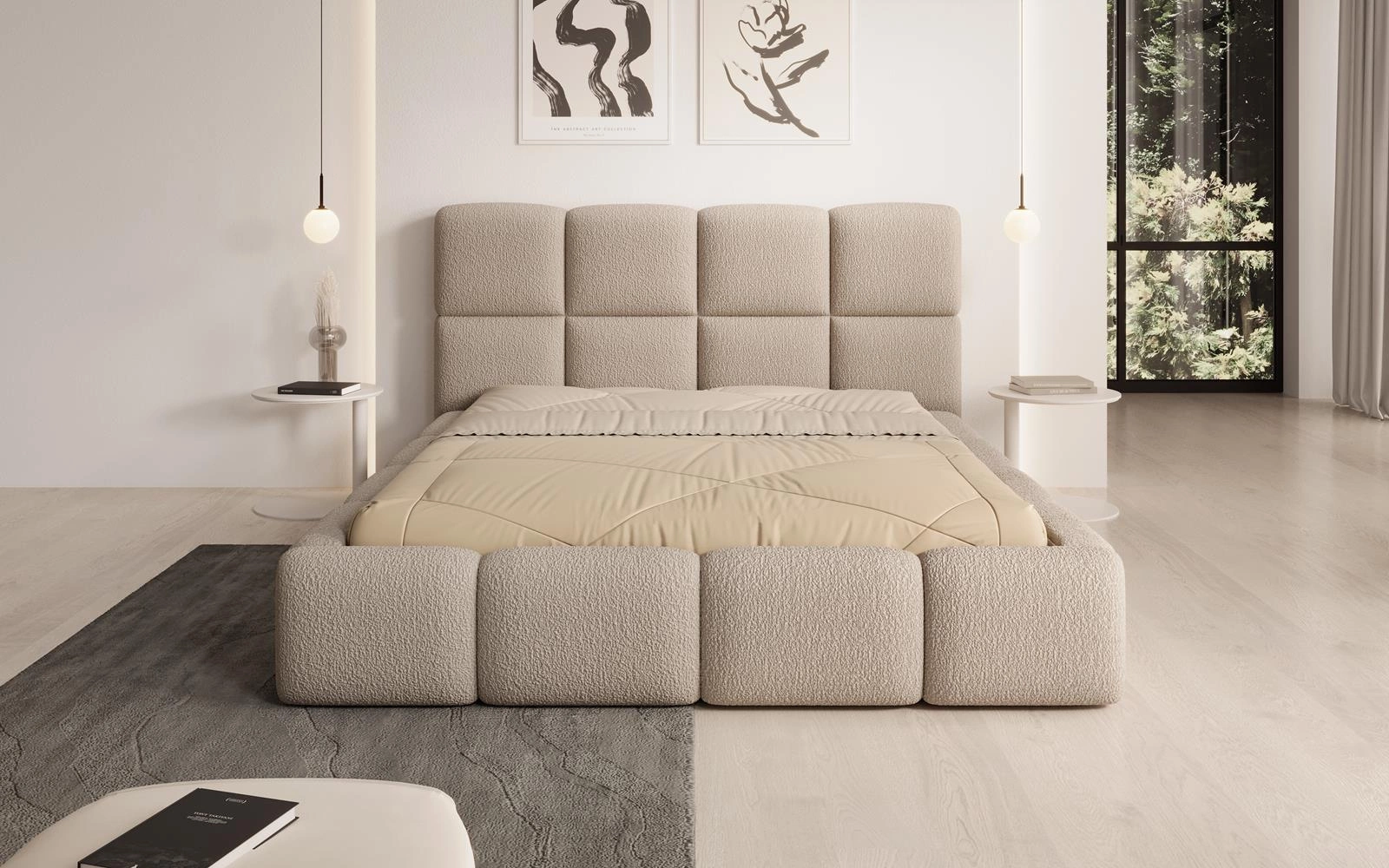 Abriamo iist ein eleganter Bouclé-Stoff, der sich durch seine dreidimensionale Struktur auszeichnet. Seine Schwerentflammbarkeit und Lichtbeständigkeit machen ihn zu einer funktionalen Lösung sowohl für öffentliche als auch für private Räume.).