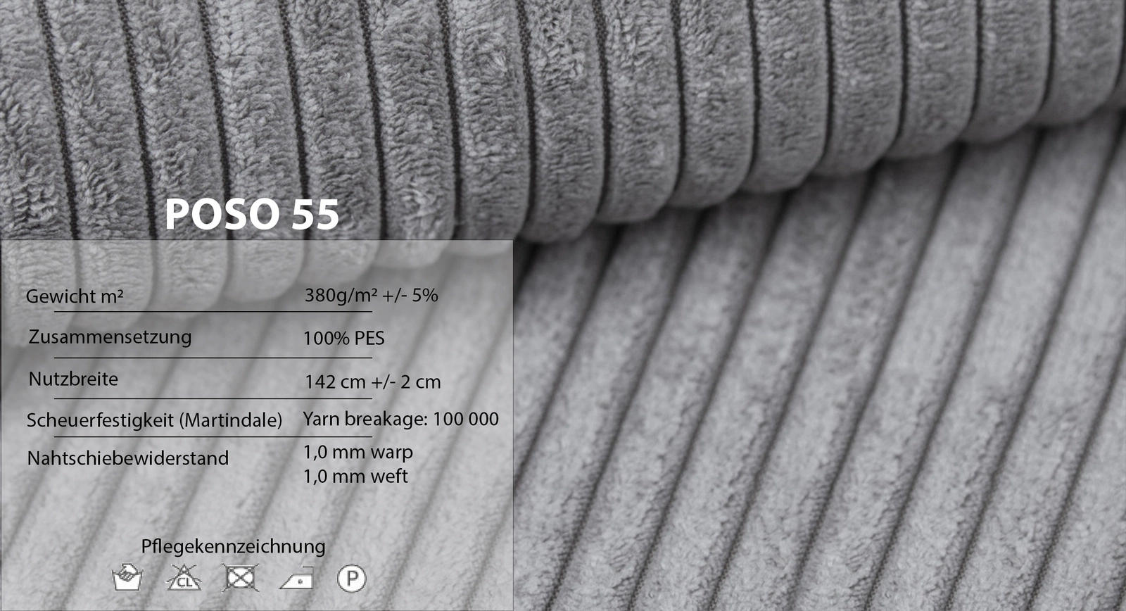 POSO ist ein ultraweicher Cord mit dicken Nadelstreifen, der sich unglaublich angenehm und weich anfühlt. Darüber hinaus verfügt es über hervorragende technische Parameter (siehe Foto).