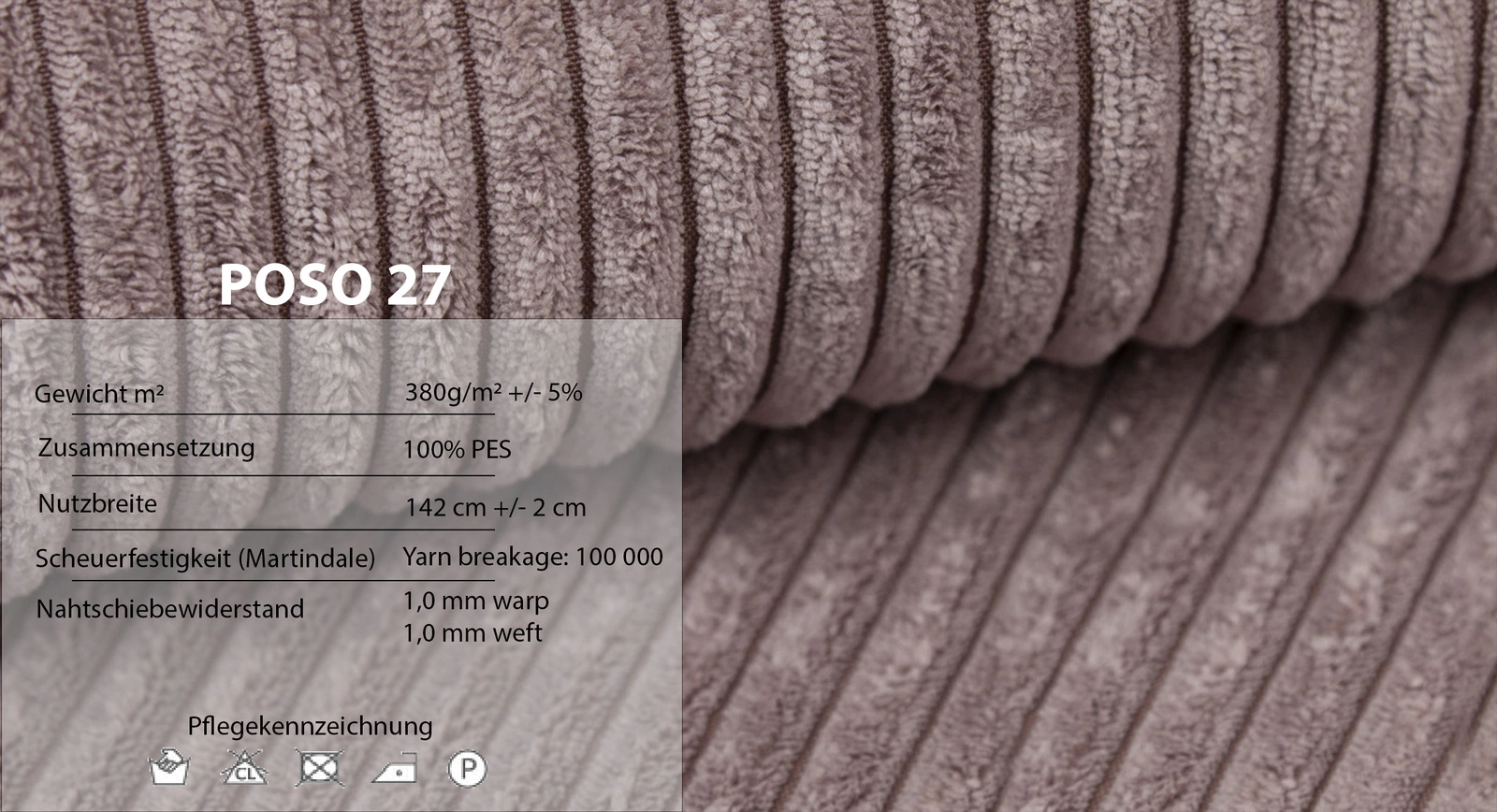 POSO ist ein ultraweicher Cord mit dicken Nadelstreifen, der sich unglaublich angenehm und weich anfühlt. Darüber hinaus verfügt es über hervorragende technische Parameter (siehe Foto).