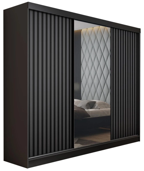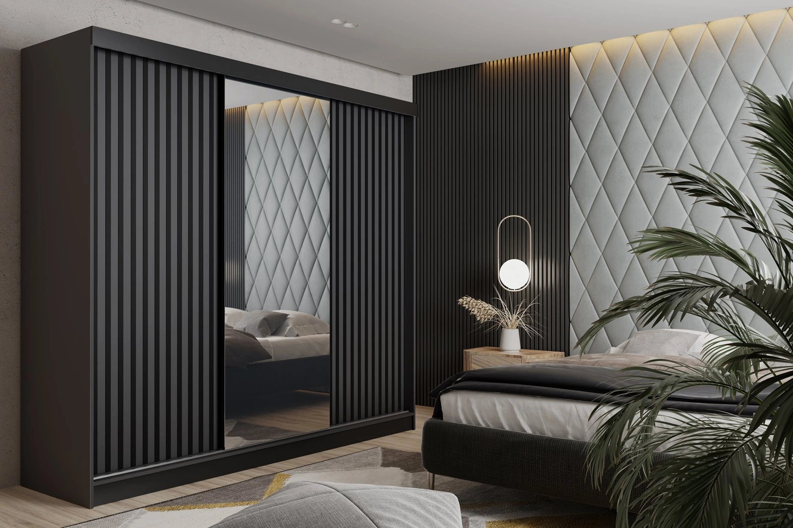Der Schrank ist mit einem großen, eingebauten Spiegel ausgestattet, der dem Raum Leichtigkeit verleiht und ihn optisch vergrößert. Der Spiegel ist nicht nur ein praktisches Accessoire, das die täglichen Vorbereitungen erleichtert, sondern auch ein Element, das den modernen Stil des Schranks unterstreicht. Perfekt integriert mit den Lamellen, schafft er ein harmonisches Ganzes, das den Blick auf sich zieht.