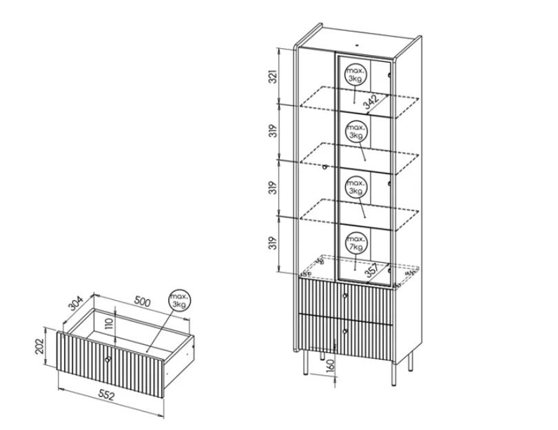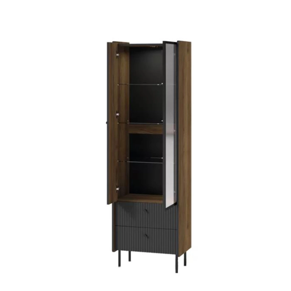 Standvitrine COMO 2 Türig mit gerillte Front Schwarz/Nussbaum