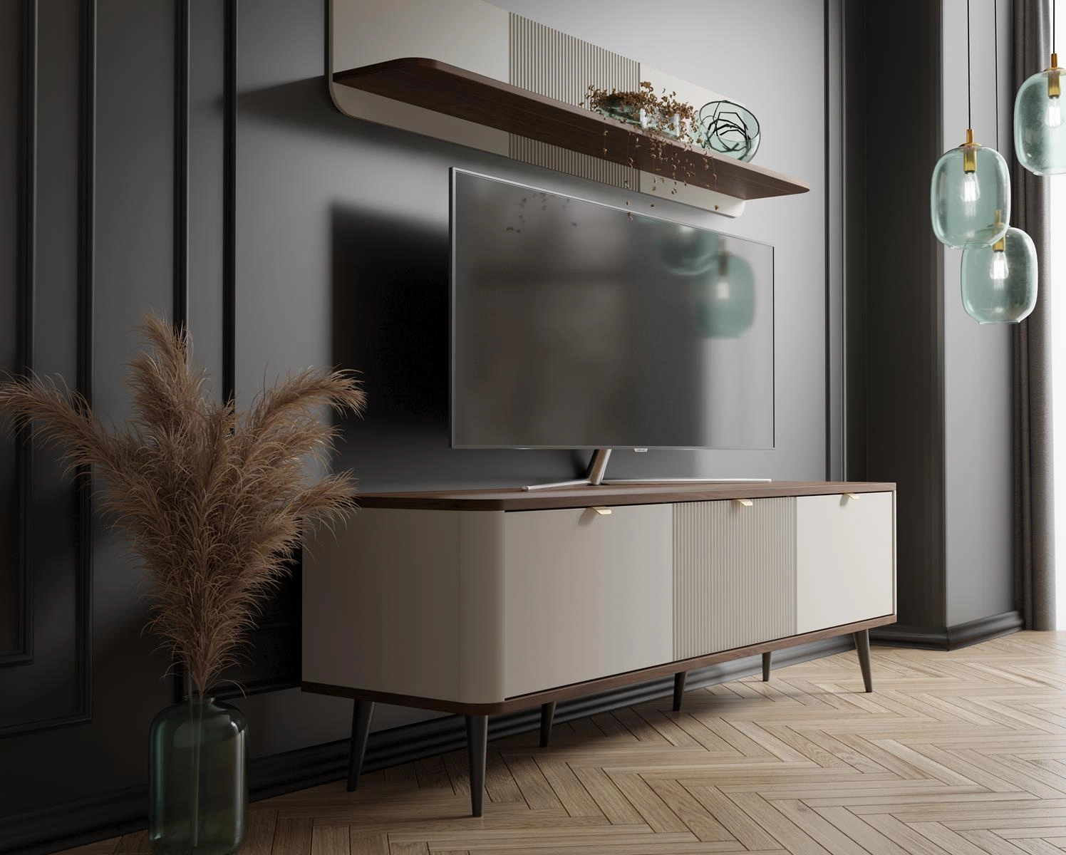 TV-Kommode mit Lamellen LILIA Kaschmir + Nussbaum